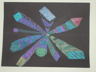 After their buildings were drawn in pencil, they outlined them with Gel Markers and construction paper crayons which work great on black paper. This gave their city a night time look. They also added details- windows, patterns, helicopter landing pads- to their buildings.